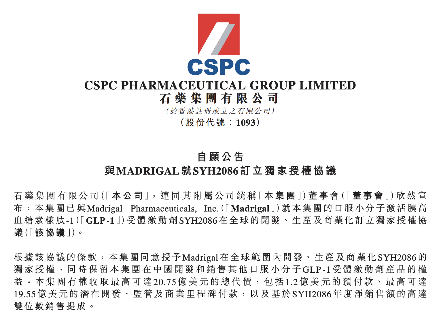 周三,石药集团发布公告,宣布与美国生物制药公司Madrigal Pharmaceuticals达成重磅授权协议,将其口服GLP-1受体激动剂SYH2086的全球开发、生产及商业化权益授予后者,交易总价值最高可达20.75亿美元。这标志着中国制药企业在全球减肥和糖尿病治疗领域的重要突破。